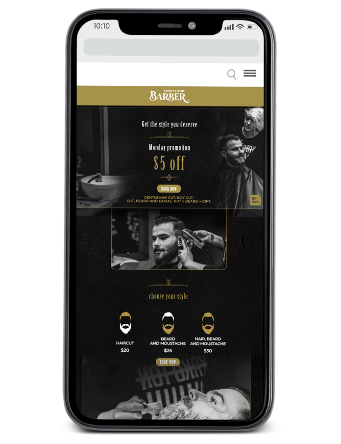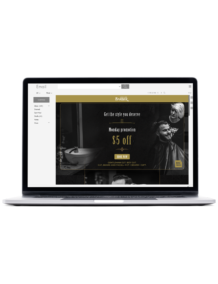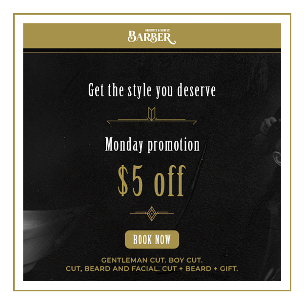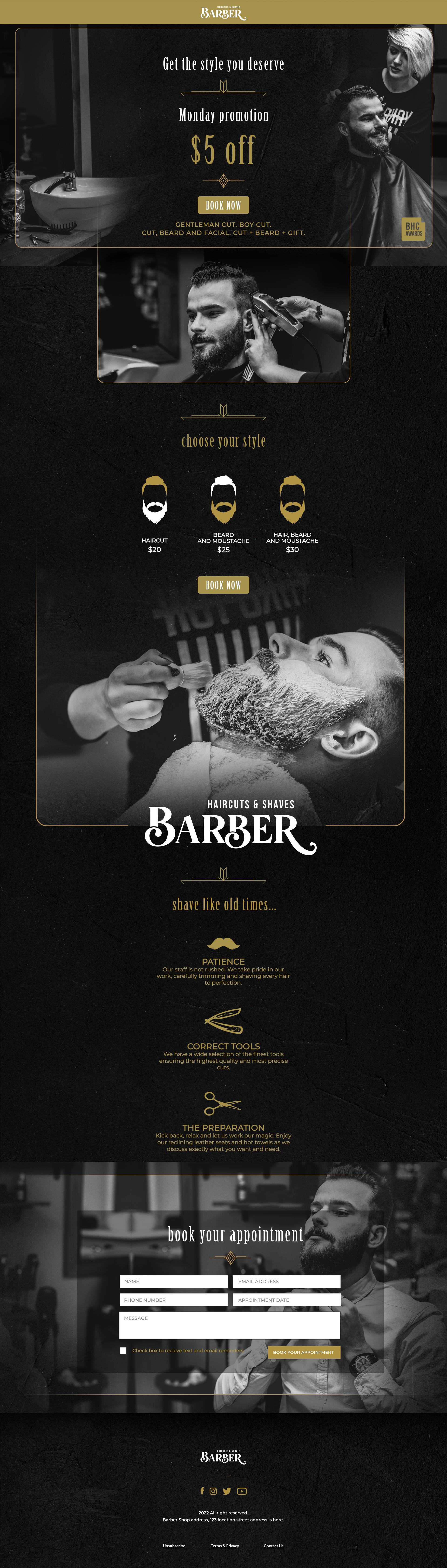 This project showcases an advertising campaign for a Barber Shop. It introduces a promotion and leads into services with calls to action throughout the composition. The use of imagery and sophisticated design reflects the company's prestigious services.