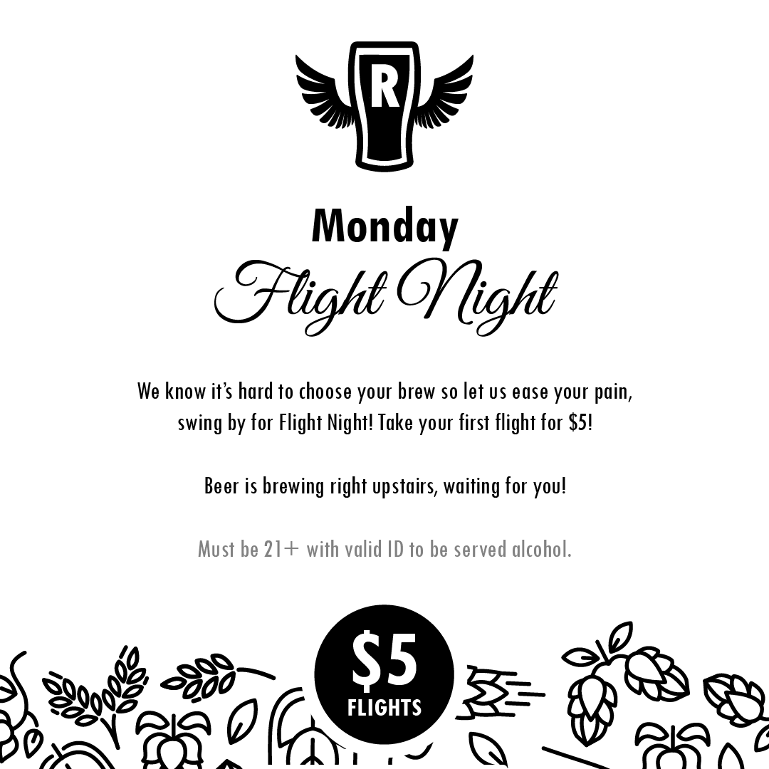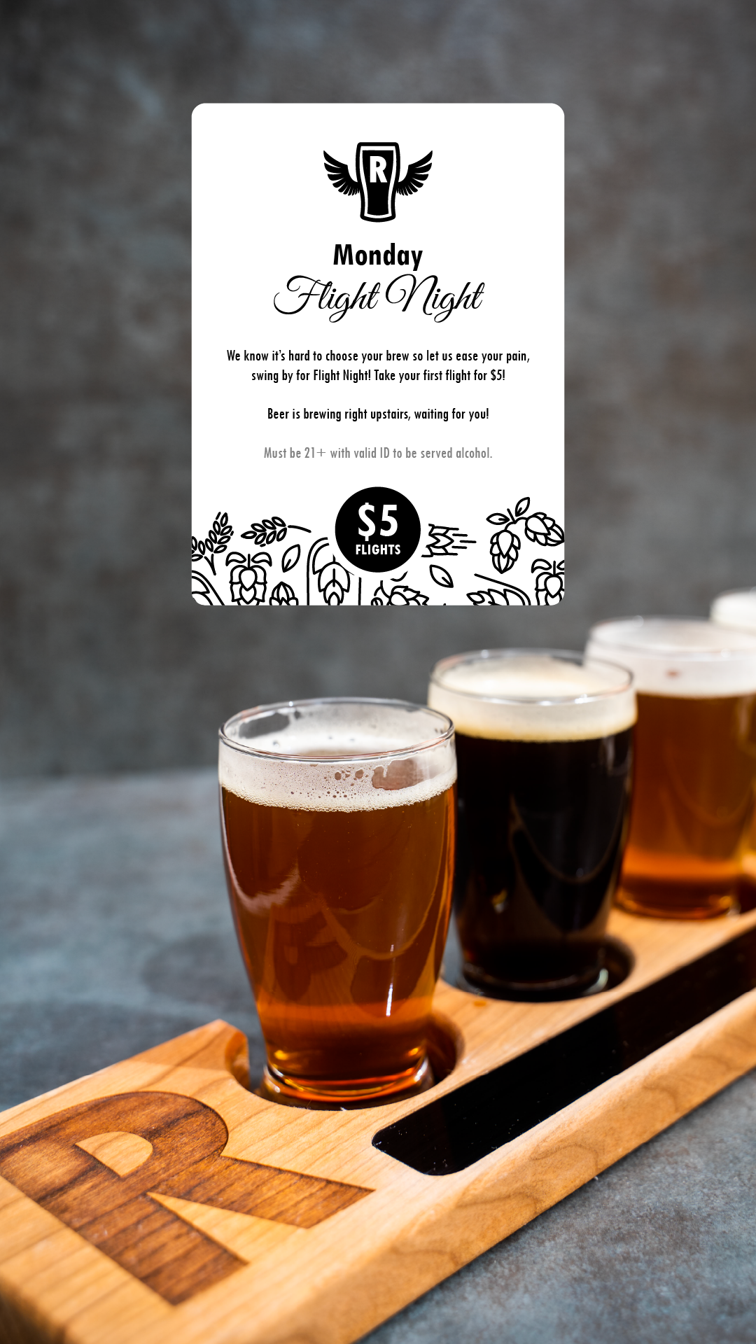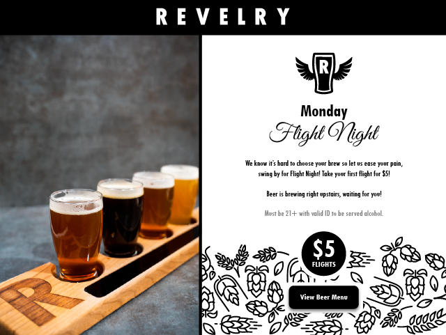 This project showcases work for the restaurant, Revelry Yards, in Ithaca NY. This is a marketing campaign for a weekly promotion advertising Monday Flight Night.
