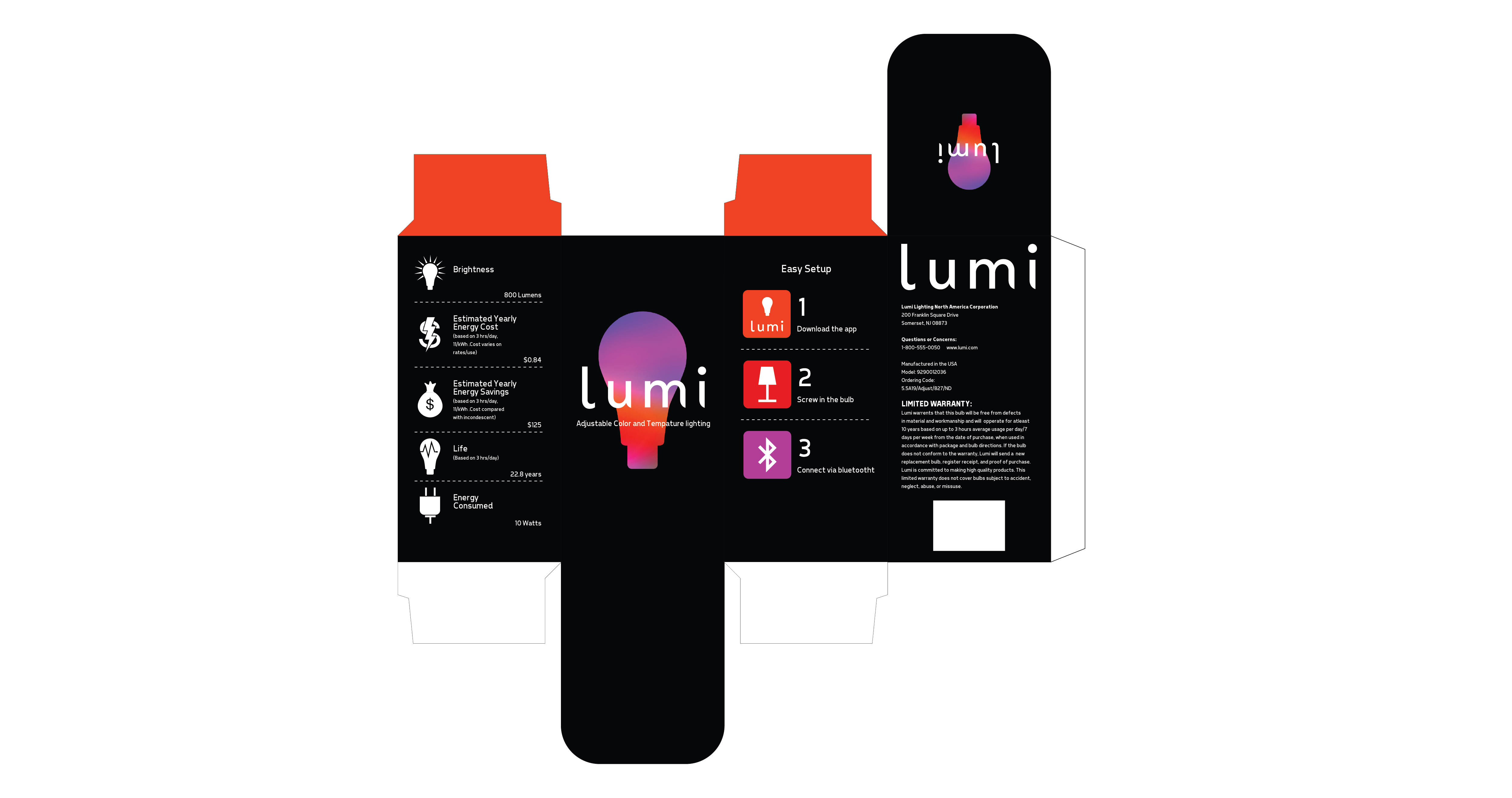 This project showcases a package design for an app controlled lightbulb. This design features elements such as the logo, product information, set up instructions, and company and warranty information.